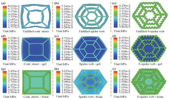 Finite element analysis results of impact mechanical properties of the integrated bio-inspired structure (a) FE simulation results of an unfilled contrast structure. (b) FE simulation results of an unfilled spider web. (c) FE simulation results of an unfilled S-spider web. (d) FE simulation results of a contrast structure-gel. (e) FE simulation results of a spider web-gel. (f) FE simulation results of an S-spider web-gel. (g) FE simulation results of a contrast structure-foam. (h) FE simulation results ofa spider web-foam. (i) FE simulation results of an S-spider web-foam [49].