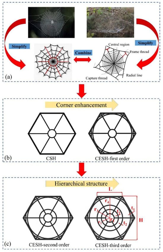 Design of angle-reinforced spider web honeycomb biomimetic structure. (a) Natural spiderweb structure and its simplified representation; (b) corner- enhanced biomimetic spiderweb-structured honeycomb models; and (c) corner-enhanced biomimetic spiderweb hierarchies [53].