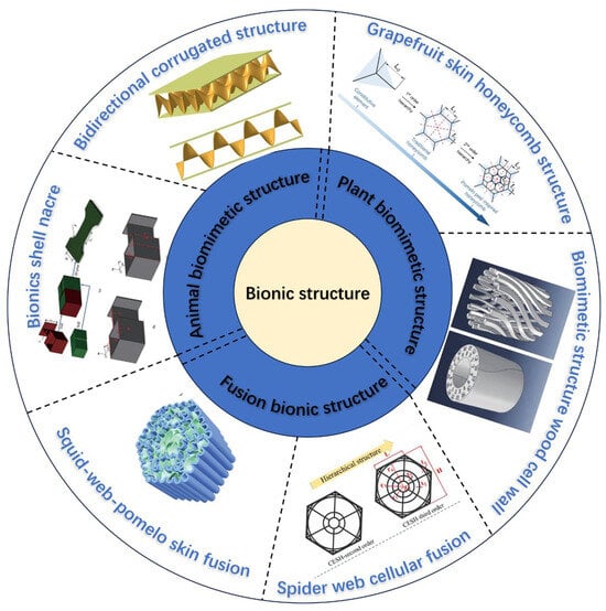 Biomimetic structures can reduce the use of materials and ensure stable performance. The comparative analysis in Table 1 shows that the integration of multiple biomimetic structures has obvious advantages over traditional biomimetic structures. In terms of energy consumption, the angular reinforced spiderweb honeycomb structure can better disperse the stress, and the fracture energy absorption is as high as 1494 kN·mm. In terms of the tensile strength, the biomimetic structure inspired by the cell wall of wood is able to improve its tensile performance due to its internal helical structure, and the highest tensile strength can reach 34.9 MPa. The bidirectional corrugated structure can evenly distribute stress to each contact point during compression, so the compression strength reaches 690 MPa, which is 13 times higher than that of the biomimetic structure of the wood cell wall. However, due to the different materials used, some deviation may exist between the experimental data and the actual performance. Therefore, the specific performance data need to be determined according to the materials used. By comparing the different biomimetic structures mentioned above and describing their respective advantages and disadvantages, representative biomimetic structures of animals, plants, and fusion biomimetics are summarized for a more intuitive understanding of the differences between different biomimetic structures, as shown in Figure 9.