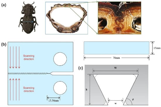 Design of interlocked structure imitating the exoskeleton of the armored beetle (a) biological suture interface; (b) design of the specimen model; (c) parameters of inter locked tooth [75].