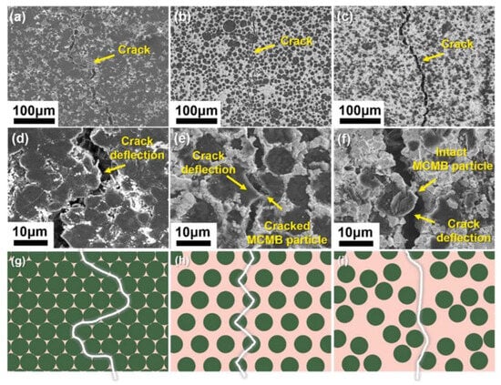 (a–c) Low-power SEM images of MCMB@WC crack growth path under different volume fractions: (a) 17%; (b) 53%; (c) non-biomimetic structure; (d–f) high-power SEM images of MCMB@WC crack growth path under different volume fractions: (d) 17%; (e) 53%; (f) non-biomimetic structure; (g–i) schematic diagram of MCMB@WC crack growth under different volume fractions: (g) 17%; (h) 53% and (i) non-biomimetic structures [13].