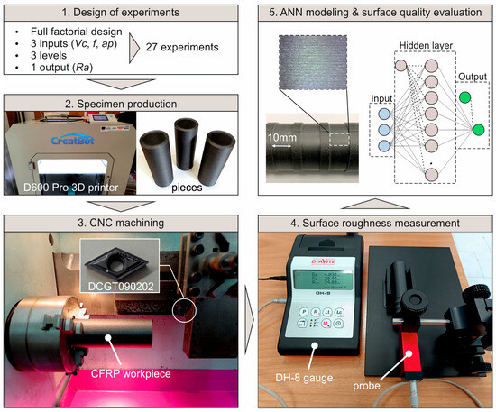 The present study deals with a machinability evaluation of a composite filament used in 3D printing, which is based on carbon-fiber-reinforced PETG. As illustrated in Figure 1, the study is divided into five steps. First, the machining experiments were designed according to three critical cutting parameters and their corresponding levels. Next, the cylindrical workpieces were fabricated. During step 3, the machining tests were carried out with the aid of a CNC lathe and appropriate tooling. Next, the surface roughness of the machined pieces was measured according to the corresponding standards, by utilizing mechanical measurement methods. Finally, the collected data were further analyzed by examining enhanced images of the machined surfaces. In addition, the response was modeled with machine learning techniques. The next sections discuss both the experimental framework and the modeling procedure.