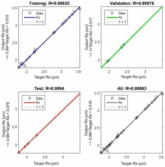 Figure 3 illustrates the regression plots for the modeled surface roughness. Each plot corresponds to a data set according to the grouping done during the ANN development. By observing the plots, the strong fit between the experimental and the modeled surface roughness is evident. First of all, it is shown that the majority of the predicted data points are on the zero-error line (Y = T), with deviations being scarce. Second, the fit line and the error line are collinear, proving the increased accuracy. Moreover, the high coefficient R values generated further support the high levels of accuracy of the model. This fact contributes towards the computation of low errors. Finalizing, as shown in Figure 3, the coefficient R for the training data set, the validation, the testing, and the summation of the data were calculated as equal to 0.99835, 0.99978, 0.99940, and 0.99863, respectively.