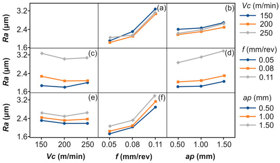 Interaction plot matrix between the three cutting conditions: (a) Vc-f, (b) Vc-ap, (c) f-Vc, (d) f-ap, (e) ap-Vc, and (f) ap-f.