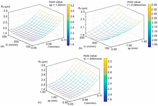 In specific, Figure 6a shows that the cutting speed and feed rate exhibit a significant combined influence on roughness. Lowering f and increasing Vc will result in smoother surfaces. However, at higher feeds, even increasing speed does not fully compensate for the increased roughness. Moreover, an optimal point is revealed close to 200 m/min. Figure 6b highlights that the combination of lower cutting speeds and larger depths of cut is responsible for the generation of higher roughness values. In addition, it is shown that increasing the cutting speed reduces roughness, even at larger depths of cut. However, there is a certain point at around 225 m/min, after which the roughness worsens at ap > 1.25 mm. Lastly, the steepest rise in Ra is pointed out by Figure 6c, in the region where both the feed rate and depth of cut are high, specifically, at 0.08 mm/rev to 0.11 mm/rev feed and between 1.00 mm to 1.50 mm depth. Moreover, it is shown that the feed rate has the strongest influence on Ra in this combination. Even at a constant cutting speed, high feed rates combined with high depths of cut lead to the roughest surfaces.