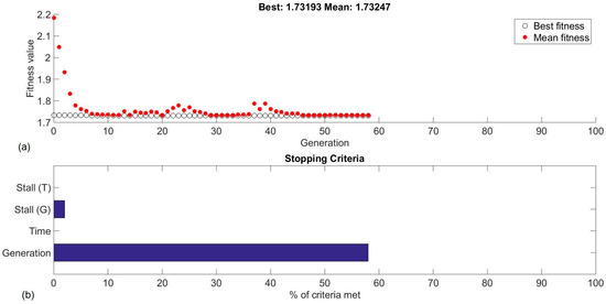Optimizing response with the GA: (a) the fitness value vs generations plot and (b) the stopping criteria chart.