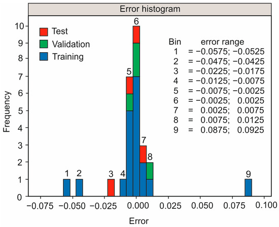 To analyze the performance of the model, the error ratios were computed. The errors were determined as the difference between the predicted values and the experimental data. Figure 8 illustrates the errors in bins for all three data sets. It is evident that the majority of the errors are around error bin number 6, which crosses the zero-error line. Despite the presence of a few errors farther from this bin, the small errors prove the success of the ANN model training process, as well as the accuracy of the prediction capabilities. It is noted that the summation of the errors is 27, of which 4 correspond to the test step, 4 to the validation step, and 19 to the training process.