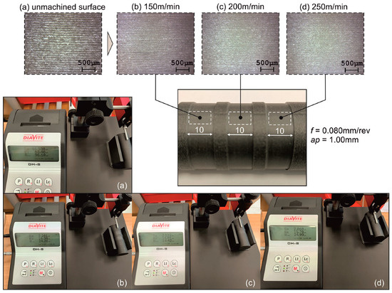 Enhanced images of the unmachined surface and three consecutive cuts, as well as the corresponding measurements, at different cutting speeds: (a) unmachined, (b) 150 m/min, (c) 200 m/min, and (d) 250 m/min.
