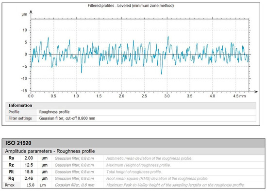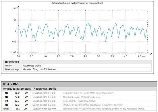 Figure 10 and Figure 11 depict the roughness profiles for the unmachined surface and the machined surface of an indicative test, respectively, which refers to the previously mentioned test (Figure 9c), with the following settings: Vc = 200 m/min, f = 0.08 mm/rev, and ap = 1.00 mm. By observing the roughness profiles and their corresponding measurements, a comparison can be made between the material’s raw surface and the generated surface quality after the post processing. It is noted that the average surface roughness, Ra, drops from 16 μm to approximately 2 μm, providing a remarkable improvement to the surface quality. This magnitude of improvement is evident for the other roughness parameters, such as the average maximum height, Rz, and the total height, Rt. Finally, the maximum distance from peak to valley, Rmax, is particularly interesting, since it is connected to surface defects such as scratches. Moreover, the fabrication method of the specimens and the nature of the material make the specimens more prone to increased levels of Rmax. For the unmachined surface, it was measured to approximately 88.7 μm, whereas for the machined surface it was measured to about 15.8 μm, highlighting the considerable improvement of the surface quality.