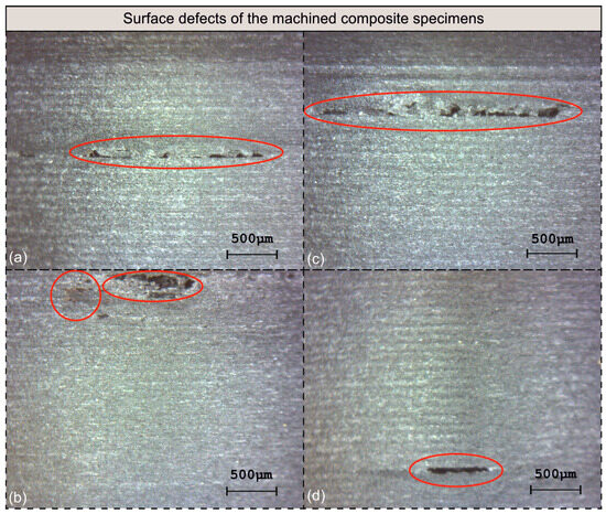 Next, each of the specimens were examined for defects regarding the surface integrity. Figure 12 illustrates the observed flaws. In detail, Figure 12a–d depict the machined surfaces of test numbers 2, 6, 9, and 27, respectively. It is shown that all surfaces share a common flaw, that is, the material being scraped. Surface number 2 (Figure 12a) exhibits a propagation of material scraping of approximately 1.8 mm long, whereas surface number 6 (Figure 12b) suffers from material scraping of an area 750 μm long, with a maximum width of 215 μm, which is accompanied by a discolored area nearby. Surface number 9 (Figure 12c) exhibits a defect of similar pattern to the one observed on surface number 2, with a length of approximately 2.3 mm. Finally, an almost 500 μm long scratch is evident on surface number 9 (Figure 12d). Three out of four surfaces were machined at a depth of cut equal to 1.50 mm, suggesting that deeper cuts probably lead to the generation of scratches along the circumference of the workpiece as a result of higher cutting forces, tool deflection, and increased vibrations. In addition, with the exception of one test, the other three surfaces were machined at 150 m/min speed. Abena et al. [48] highlighted the generation of significantly higher cutting forces, at a magnitude of 100 N to 300 N, for depths of cut lower to the ones applied in this study. Recent findings highlighting the effect of increased feed rates on the generated forces have been reported by Ge et al. [59] for similar carbon-fiber-reinforced materials.
