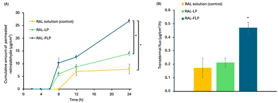 3.1.4. In Vitro Skin Permeation of Retinal-Loaded Liposomes