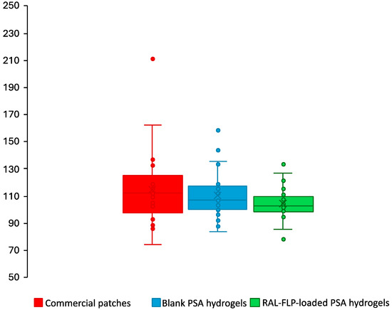 | F3 | Soft and adhesive | 5.73 ± 0.30 | 3.13 ± 0.90 |