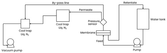 Pervaporation is a separation technique which utilizes the semi-permeable membrane for preferable selective transport of penetrants that are in the liquid phase on the feed side and the gas phase (vapor) on the permeate side, meaning that liquid evaporation occurs on the immediate interphase of the liquid and feed side of the membrane. The driving force for the vapor transport arises from a chemical potential gradient between feed and permeate sides of membranes created by the application of a vacuum or sweep gas to the permeate side of the membrane causing efficient vapor withdrawal [28]. In this study, pervaporation experiments were performed in addition to the “pressure increase” experiment to provide a comprehensive analysis of membrane performance under different operational conditions with the aim of covering a wide range of feed vapor activity, starting from 100% activity for the case of pervaporation and going from ca. 90 to ca 20% activity in the case of the “pressure increase” experiment. Pervaporation, involving a phase change from liquid to vapor across the membrane, offers distinct insights into the membrane’s efficiency where liquid water is present on the feed side. It is important to note that one of the highlights of this study is the analysis of two water phases, vapor and liquid, that contact the film surface and how this interaction influences vapor transport. Figure 2 shows the schematic flow chart of the pervaporation facility used in this study. A circulation pump provides liquid water circulation from the water tank through the measurement cell containing the membrane under study and back to the water tank. On the permeate side of the measurement cell, a pressure sensor is installed to monitor permeate pressure during the experiment, while the permeate stream is directed into a cold trap cooled with liquid nitrogen for water condensation. To protect the vacuum pump from moisture during the changing of the permeate cold trap, a second cold trap is included in a bypass line. During each measurement session for each membrane sample, 10 measurement points were recorded, with permeate water collected into a cold trap for 5 min at each point. Approximately 15 min were spent between consequent measurements: 5 min for the permeate collection and an additional 10 min to prepare the system for the next measurement, including exchange, evacuation, and accommodation of the new trap to liquid nitrogen temperature. This timing of the experimental sequence is crucial as it was thought to provide an indication of membrane properties’ changes during the experiments. In total, it takes ca. two hours to complete the pervaporation experiment for one membrane. It was assumed that the feed side vapor pressure was 70 mbar, taken as a saturated vapor state at 40 °C, and permeate vapor pressure was considered zero since the vacuum was provided by a rotary pump and additionally by the liquid nitrogen temperature of the cold permeate trap.