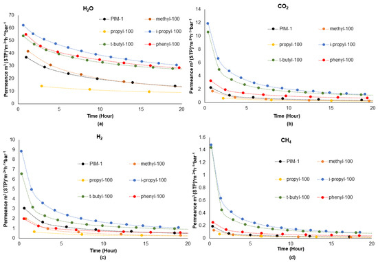 In this study, the experimental results obtained for TFC membranes with selective layers of homopolymers show differences from those obtained for thick isotropic films. Figure 3 shows the gas permeance decay of each homopolymer-based TFC membrane observed over the span of 20 h. The complete measurements for each TFC membrane can be found in Figure S1.