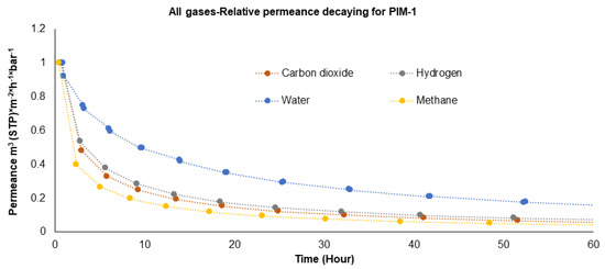 Decay of relative gas and water vapor permeance of PIM-1 TFC membrane.