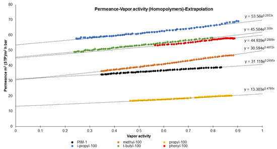 Another aspect that can be examined is water vapor permeance as a function of feed vapor activity. Figure 5 renders a series of plots for different homopolymers and demonstrates that the permeance of all homopolymers, including PIM-1, increases with vapor activity, which is expected as higher vapor activity generally increases the driving force for permeation. Davis et al. reported that at higher vapor activities, water molecule association increased, followed by an enhancement in water permeability [29]. Unfortunately, design limitations of the experimental facility prevent experiments at vapor activity above 90%. But the acquired data demonstrate a clear upward trend in permeance as vapor activity increases. The trend can be fitted by the exponential function with the coefficient of determination above 98%. The use of the exponential function is justified by the consideration of vapor as penetrant due to being close to the condensation, and the equation of the “Free Volume Model” can be applied instead of apparent linear regression [43]. Taking into account no significant swelling of the selective layer by water vapor, clearly indicated by small values of the exponent coefficient, and the fact that the experimental data start at 90% of vapor activity, one can assume the validity of the applied function to be extended up to 100% activity and thus to prognose vapor permeance at saturation conditions.