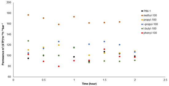 When compared with examples where linear alkyl groups were replaced with bulkier groups such as “-i-propyl” or “-t-butyl”, it was observed that bulky, in comparison to “-methyl”, side groups influenced both diffusivity and solubility and, hence, gas permeability. The introduction of bulky groups significantly increased the free volume, which consequently increased the diffusion coefficient.