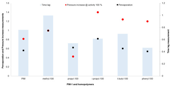 Up to this point in the current study, the water vapor transport of TFC membranes prepared with previously synthesized polymers has been investigated and evaluated in two different applications. In order to extend the scope of this comparison, it would be useful to compare the findings with the “time lag” results from the previous study [20]. With this aim, Figure 7 presents a comparative analysis of three distinct measurement methods: pervaporation, “pressure increase”, and “time lag”. Each data point represents relative values to the performance of methyl-100-based films and TFC membranes. It is crucial to understand that the values indicated are not directly comparable across different methods. For instance, in pervaporation, each membrane value was divided by methyl-100 within its own measurement group. Therefore, all three measurements have the same data on methyl-100 as being equal to 1. The data include relative “pressure increase” values extrapolated to 100% vapor activity to facilitate comparison with pervaporation results. This visualization aims to show the relative changes in properties of different polymers within each method by normalizing the results against the performance of the methyl-100.