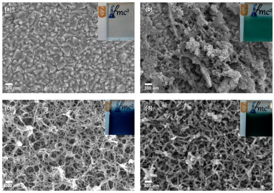 FE-SEM analysis was utilized to examine the surface structures of the counter electrode films PCbzC8, PEDOT and the doped polymer PEDOT-PCbzC8, as depicted in Figure 2. Figure 2a illustrates the surface structure of an uncoated transparent conducting oxide substrate, specifically fluorine-doped tin oxide, after being cut. The inset in Figure 2a highlights a precisely cut FTO glass with smooth edges, designed to minimize sheet resistance and reduce overall series resistance. In Figure 2b, the poly(9-octyl-9H-carbazole) (PCbzC8) film appears non-homogeneous with a rough surface compared to the other polymer films, featuring a compact and relatively low-porous structure. This increased surface roughness is anticipated to enhance electrocatalytic activity for the I−/I3− redox pair and decrease the charge transfer resistance at the CE/electrolyte interface [,], thereby potentially improving both conductivity and electrocatalytic performance of the copolymer counter electrode. Figure 2c shows the PEDOT film with a highly porous, mesh-like structure, indicating a large effective surface area that could enhance electrocatalytic activity []. However, the presence of large pores suggests a lack of well-oriented charge transfer channels within the layer [,]. To address this issue, the PEDOT-PCbzC8 doped polymer film, depicted in Figure 2d, combines the structural benefits of both materials. The copolymerization of EDOT with the CbzC8 monomer resulted in a nanotube-like structure with more oriented charge transfer channels, expected to enhance the performance of the copolymer film. Detailed cross-sectional images of PEDOT, PCbzC8 and PEDOT-PCbzC8 are presented in Figure S5 of the Supporting Information.