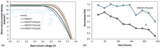 The stability of the power conversion efficiencies of dye-sensitized solar cells with Pt and PEDOT-PCbzC8 counter electrodes was evaluated over 200 h under ambient conditions. The results, illustrated in Figure 3b, show that the solar cells with PEDOT-PCbzC8 counter electrodes retained more than 70% of their initial PCE after 200 h of testing. In contrast, the PCE of DSSCs with Pt counter electrodes decreased by nearly 50% over the same period. This study highlights that PEDOT-PCbzC8 counter electrodes exhibit greater stability compared to traditional Pt counter electrodes.