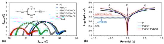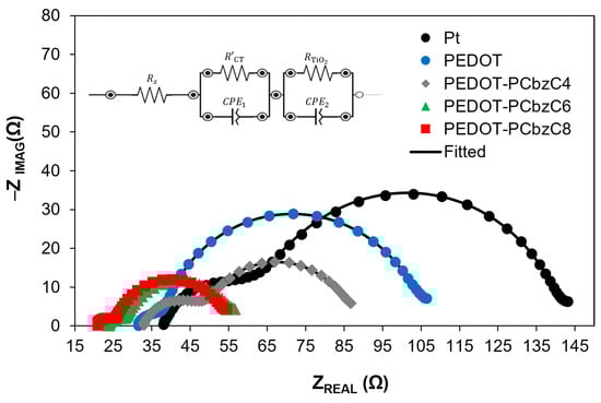 To investigate the catalytic performance of dye-sensitized solar cells with various counter electrodes, we employed electrochemical impedance spectroscopy, as illustrated in Figure 4. The impedance spectra were analyzed using an electrical equivalent circuit, which is detailed in the inset of Figure 4. The series resistance (RS), the charge transfer resistance at the CE/electrolyte interface (R’CT) and the resistance at the TiO2/dye/electrolyte interface () are represented by the X-axis intercept of the curve, the smaller semicircle at higher frequencies and the larger semicircle, respectively, across all three curves. A lower charge transfer resistance indicates superior electrocatalytic activity of the counter electrode in reducing triiodide species. Among the polymer-based counter electrodes, those with PEDOT-PCbzC8 exhibit a smaller charge transfer resistance at the CE/electrolyte interface. Specifically, the R′CT value decreases from 18.21 Ω for the Pt device to 14.00 Ω for the PEDOT-PCbzC8 device, as shown in Table 1. The reduced resistance at the interface between the electrode and the electrolyte facilitates electron transport and increases the photocurrent density, which can accelerate the regeneration process of the dye, as the iodine ions can accumulate closer to the dye. Consequently, this effect contributes to the higher current density observed in copolymeric CEs. The EIS analysis shows that the PEDOT-PCbzC8 CE has a higher catalytic activity than other copolymer CEs, such as PEDOT-PCbzC4, PEDOT-PCbzC6 and PEDOT, all of which perform better than the Pt CE.