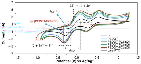 Cyclic voltammetry was utilized to evaluate the electrocatalytic performance of the counter electrodes for triiodide ion reduction. Figure 6 illustrates the cyclic voltammograms from a three-electrode electrochemical cell, where Pt, PEDOT, PEDOT-PCbzC8 and two other copolymer CEs were employed as working electrodes. The measurements were conducted in an acetonitrile solution containing LiClO4 as the supporting electrolyte, along with LiI and I2, at a scan rate of 100 mV/s. At the working electrode, iodide ion oxidation occurs, as depicted in Equation (2), while at the counter electrode, triiodide ion reduction takes place, as outlined in Equation (3) [].