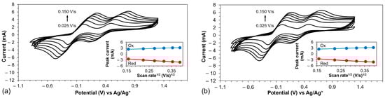 Cyclic voltammogram of (a) PEDOT and (b) PEDOT-PCbzC8 CE at different scan rates. The insets show the scan rate dependence of the peak current of the electrodes.