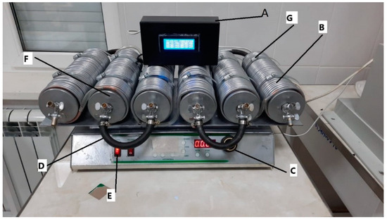 General view of the reactor. The reactor comprises several key components: the Information Processing Receiver (A) features a temperature control system for each stage; the Copper Heating/Cooling Line (B) includes outputs for connection to Hubert furnaces; the Horizontal Movement Speed Adjustment (C) is equipped with a display that indicates the number of movements per minute based on a motion sensor; the Reactor On/Off Button (D) is located next to the switch for the autonomous heating and cooling system; the Carbon Fiber Hose (E) connects the reactor stages, facilitating six mixing stages; the Reactor Pipes (Stages) (F) have advanced lid designs for optimized sealing; and finally, the Holders for Reactor Pipes (Stages) (G) provide structural support.