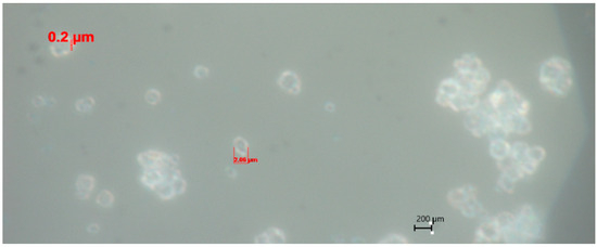 Preliminary studies showed that the size of the polymer coating layer on Azofoska (N16:P16:K16) fertilizer prepared with 10% of PVA polymer was 20 μm [51]. The thickness of the layer was measured under a microscope at 100× magnification (Figure 2). Fertilizers with the resulting polymer coating had the appearance of reddish, dry tablets (for ease of use).