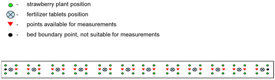 All measurements were performed using a compact field digital meter, the YY-1000 3-in-1, VitaFerma, Beijing, China, which was calibrated with standard solutions having EC values of 1.413 mS/cm and 12.880 mS/cm. In each of the 45 experimental beds, replicate measurements were taken at four sampling points to account for soil heterogeneity. On each measurement day, the sampling points were randomly selected from those marked with a red triangle in the scheme (Figure 4) to minimize the influence of any specific plant’s condition on the overall series of measurements.