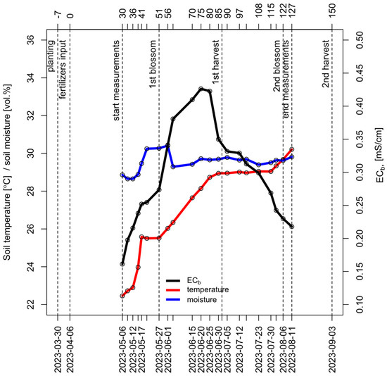 Key events of the experiment, including planting, fertilizer input, flowerings, harvests, and dates of measurements. The graph reflects the general picture of changes in temperature and soil moisture (left axis) and soil EC (right axis) throughout the experiment (averaged across all experimental variants).