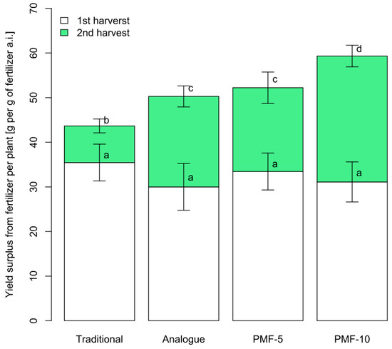 The first harvest did not differ significantly between the nutrition systems. However, the yield of the second harvest showed notable differences. Figure 6 presents the yield increase (the difference in grams per plant from the control) for each nutrition system compared to the control. The effect of using all PMF systems was significantly higher compared to the traditional system, while application of PMF-10 was statistically greater compared to the commercial analogue and PMF-5. On average, the yield increase from PMFs was 2.8 times higher than the increase from the traditional fertilization system. In the analogue system, the yield increase was 2.5 times compared to the traditional variant. For the PMF-5 system, the increase was 2.3 times, while for the PMF-10 system, it was 3.4 times.