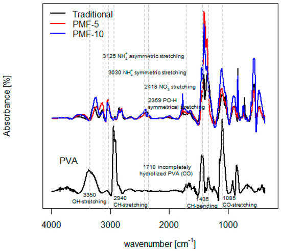 Overall, the structures of PMFs were strongly confirmed by FT-IR spectroscopy by comparing the spectra of PVA, mineral fertilizers, and their blends, which have been attributed to their characteristic functional groups. The FT-IR results indicated that PMF-5 and PMF-10 indeed differ in composition according to their PVA content. The peaks characteristic of PVA, such as those around 1435 cm−1 and 1085 cm−1, were more pronounced in the spectrum of fertilizer with higher PVA content.