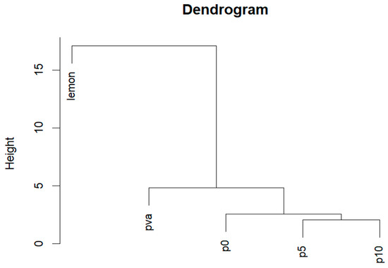 Hierarchical clustering dendrogram using Minkowski distance as metrics of dissimilarity between spectra of lemon acid, PVA, unmodified Azofoska (p0), and polymer-modified Azofoska with 5% (p5) and 10% (p10) of PVA.