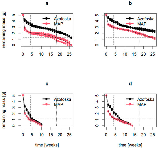 Dissolution rates of polymer-modified Azofoska and MAF, the components of PMF-5 and PMF-10 nutrition systems: (a) PMFs with 5% polymer content in laboratory; (b) PMFs with 10% polymer content in laboratory; (c) PMF with 5% polymer content in greenhouse and (d) PMF with 10% polymer content in greenhouse conditions.