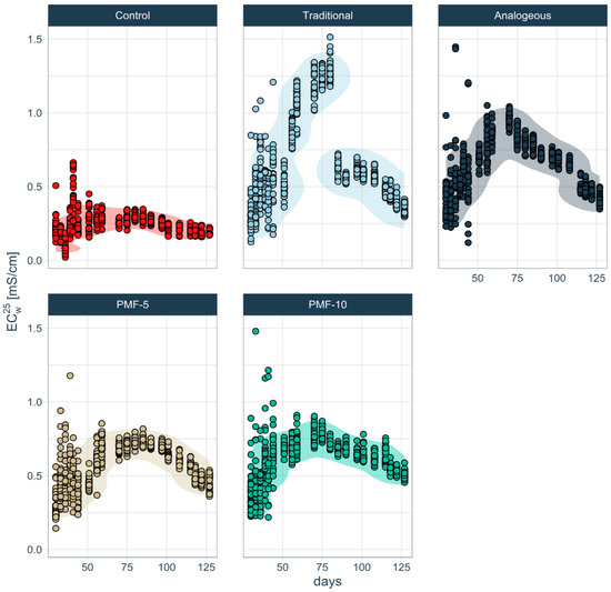 Analysis shows that all experimental variants exhibited EC profiles with a peak, significantly exceeding control values (Figure 11). This indicates that fertilizers dissolve during the growing season. However, the time pattern of fertilizer dissolution and changes in EC differ markedly between the traditional system and the three PMF systems.
