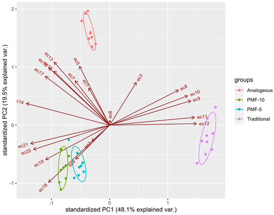 To assess the significance of differences in EC data, a PCA was performed. The results presented in Figure 12 indicate that the analogue system significantly differed from the PMF-5 and PMF-10 nutrition systems. Control data were excluded from the analysis due to their obvious differences from the others, while the traditional system was used as a reference point.