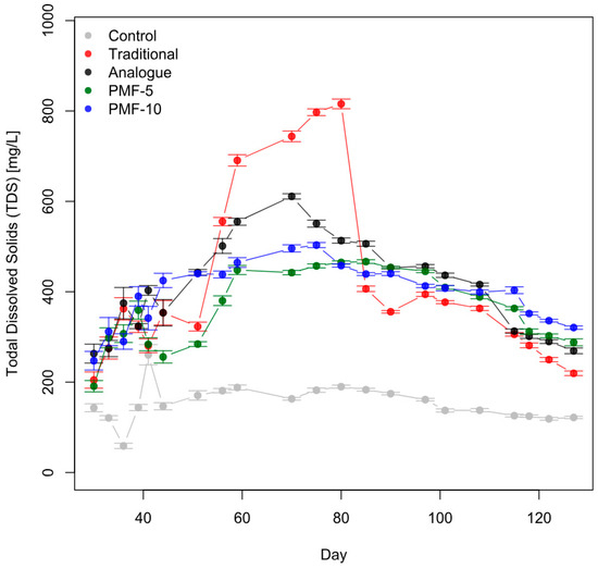 The PCA revealed that all PMF systems differed significantly from the traditional system, which was also evident from the overall shape of their EC dynamics, as seen in Figure 11. However, the PCA further showed that the PMF systems differed significantly from each other, a distinction that was not apparent from the graphical analysis alone.