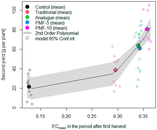 Generally, the level of nutrients has a linear effect on yield before it reaches a plateau. We analyzed the relationship between the second harvest and the average soil EC values during the period from the second flowering to the end of the measurements (Figure 14). This indicator serves as an integral characteristic, reflecting the total amount of nutrients available to the plants for the formation of the second harvest, which should have explained the yield differences observed among the experimental variants.