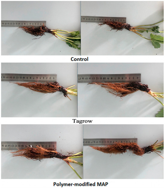 Root lengths of the strawberry variety Elizaveta with different nutrition (each shown in two replicates): control (10–11 cm), TAGROW CRF (13–14 cm), MAP PMF with polymer content 10% (15–18 cm).