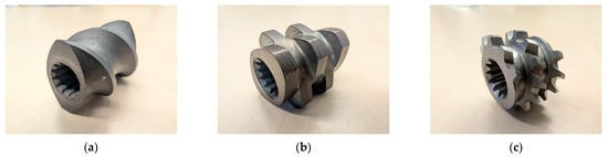 Dispersive and distributive mixing is realised in the mixing zone with different screw elements, such as non-conveying kneading blocks, toothed mixing elements or screw mixing elements. The difference between the mixing types is that in dispersive mixing, the filler particles are crushed, whereas in distributive mixing, the filler particles are distributed. Screw elements such as the conveying and kneading elements of a twin-screw extruder are still based on classic self-cleaning Erdmenger profiles. Through further development of these screw elements, new non-self-cleaning profiles such as mixing, shearing and accumulation elements have been developed. Figure 2a–c shows some of these screw elements [1,11,12,13,14].