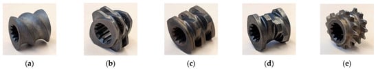 (a) Visualisations of the screw elements used: (a) SE, (b) KB12, (c) KB24, (d) KB45, and (e) ZME.