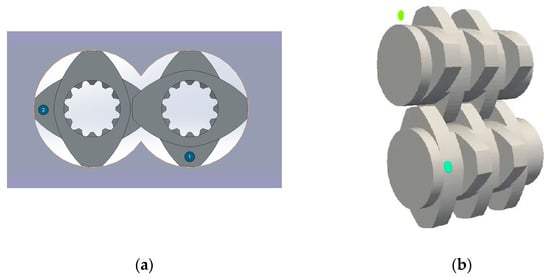 The geometric parameters of the two following machines were used for the simulation: the ZSK25 (ZSK25, Coperion GmbH, Stuttgart, Germany), with a diameter of 25 mm, and the ZE28BP (ZE28BP, KraussMaffei Group GmbH, Parsdorf, Germany), with a diameter of 28 mm. On the process side, a melt temperature of 220 °C, a throughput of 20 kg/h for the ZSK25 and 22.4 kg/h for the ZE28BP and rotation speeds of 200, 300 and 400 rpm were set. The flow in the flow region was simulated for a total of 30 s. The 30 s were divided again into 3600 time steps so that one time step corresponded to 1/120 s. The points for the particle tracking were added from seed points with specified coordinates in the flow. For each seed point, 377 points were initialised per time step. Figure 5a shows the distribution of the seed points for the particles graphically. The two seed points were positioned in the centre of the channel height, offset by 90° to each other, positioned adjacent to the screw element, not covered by the screw element geometry and rotated at the same rotation speed around the axis of the screw elements. Because of the high number of time steps and the symmetry of the elements, only two seed points were selected. Figure 5b visualises the entire flow region with the inlet, the two seed points, the screw element and the outlet.