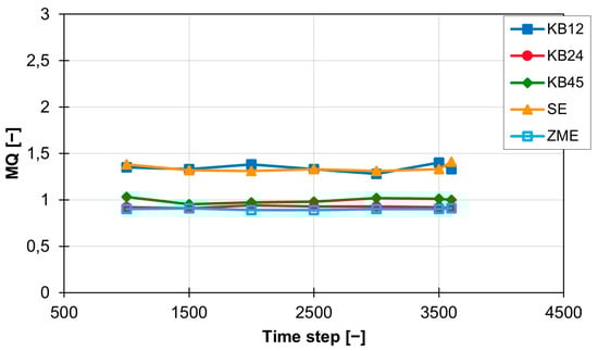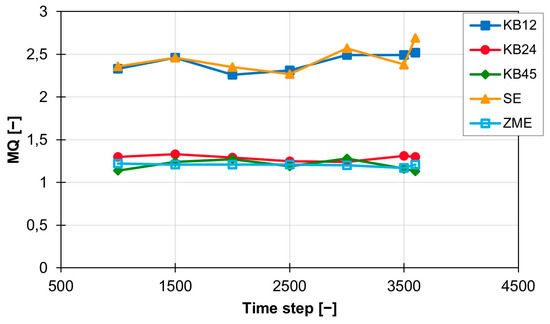 The conveying element SE and the short kneading block KB12 lead to an MQ value of approx. 2.4 and, with a standard deviation of 0.11 for the kneading block and 0.15 for the conveying element, have approximately the same mixing effect as well as a standard deviation on the same scale. The MQ values of the three other screw elements (KB24, KB45 and ZME) are also close to each other and are all around 1.2. The standard deviation for the three elements varies between 0.06 (KB45), 0.03 (KB24) and 0.02 (ZME). At a rotation speed of 300 rpm, the temporal distribution of the MQ value is shown in Figure 7. The values for the KB12 and the SE are both still higher than the values for the three other screw elements, but the distance between the two ranges is halved from approx. 1.2 to approx. 0.6. The new MQ values for the KB12 and the SE are between 1.5 and 1.7. The standard deviation also becomes smaller and is 0.09 (KB12) and 0.14 (SE). The MQ values for KB24, KB45 and ZME are also slightly below the MQ values calculated at 200 rpm, but the distance between the three curves is increased. The ZME achieves the best MQ values of 0.92. The KB24 comes next with an MQ value of 1.02, and the KB45 is last with an MQ value of 1.16. The standard deviation for the KB24 and the ZME are lower and are now 0.027 (KB24) and 0.014 (ZME). Only the standard deviation for the KB45 is increased slightly to 0.07 compared with the value at 200 rpm.