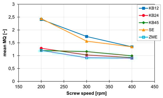 The standard deviation is reduced for all curves and is now between 0.04 (KB12) and 0.008 (ZME). In addition, the MQ value is constant over time within a rotation speed range and thus, a constant mixing performance is generated with the screw elements. It is also clear that the standard deviation of the MQ values for all screw elements decreases as the screw speed increases. The curves of the mean values of MQ for the individual screw elements are shown in Figure 9. This graph clearly shows that increasing the rotation speed leads to a reduction in the MQ values. This relationship is independent of the screw geometry, but the magnitude of the influence of the rotation speed change on the MQ value depends on the screw element geometry. This becomes clear with the SE and the KB12, which are most strongly influenced by the change in screw rotation speed. The value for MQ decreases by 1.1 for both when increasing from 200 to 400 rpm. The mixing behaviour of the ZME, the KB24 and the KB45 are not so strongly influenced by the rotation speed. For these three screw elements, the value for MQ only decreases by approx. 0.3 with the same rotation speed change.