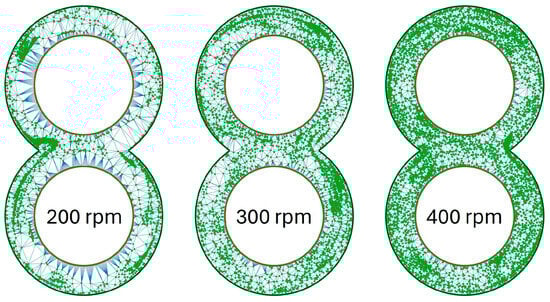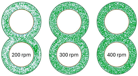 The graphics for the KB12 look similar to what is shown in Figure 10 and are illustrated in Figure 11. At 200 rpm, it is noticeable that one-half of the circle in the upper and lower circles contains particles, and the opposite side contains hardly any particles. This division of the circle areas is no longer present at 300 rpm, but particle accumulations near the cylinder wall can also be recognised here. These are very clearly recognisable in the lower left circle area. At 400 rpm, the particles are again distributed much more evenly, and the particle clusters exist both in the channel and near the cylinder wall but are no longer that large.