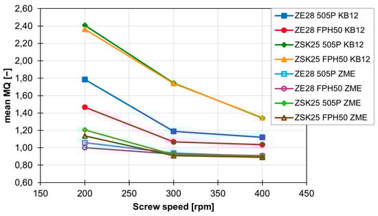 Development of the MQ values for the ZME and the KB12 for the different extruder sizes and materials as a function of rotation speed.