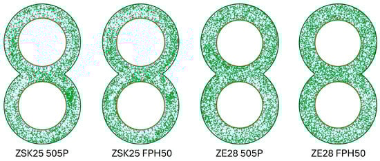 Especially at low speeds, a slightly better MQ value can be achieved with the ZE28. The FPH50 can also achieve a slightly better MQ value compared with 505P. Graphically, this slight difference is difficult to see. As shown in Figure 14, only a few differences between the 505P and FPH50 materials are recognisable. The particle accumulation in the ZSK25 with FPH50 is smaller than in the ZSK25 with 505P, but it is still present. This difference is even smaller with the ZE28. Only a few white areas are no longer present when switching to FPH50. The influence of the extruder size, on the other hand, is clearly recognisable, as the particle accumulations are no longer present in the ZE28 in contrast to the ZSK25.