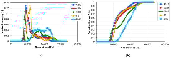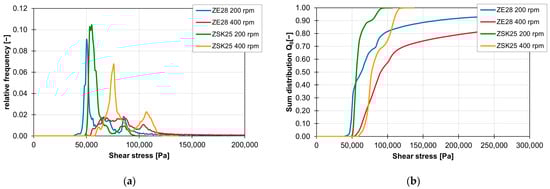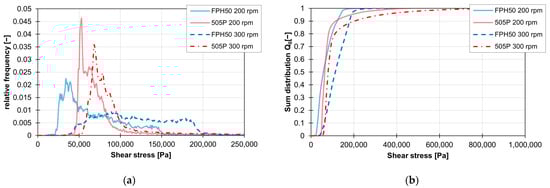 The influence of the material on the distribution of the shear stress and the sum distribution are shown in Figure 16a,b. The frequency distribution of the shear stresses with the material FPH50 starts at approx. 25,000 Pa and ends at approx. 50,000 Pa. The material with a higher viscosity, 505P, experiences higher shear stresses. Here, the frequency distribution of the shear stresses starts at approx. 80,000 Pa and ends at approx. 130,000 Pa. This means that the frequency distribution of the shear stresses for the ZME at 200 1/min is twice as wide with the 505P material than with the FPH50 material. On the other hand, the relative frequency of the particles with the respective shear stress is accordingly only half as large. However, the geometric course of the frequency distribution of the shear stresses remains approximately the same, which can be seen in the linear courses of the sum distribution. Only the gradient is different because of the different widths of the frequency distribution of the shear stresses.
