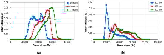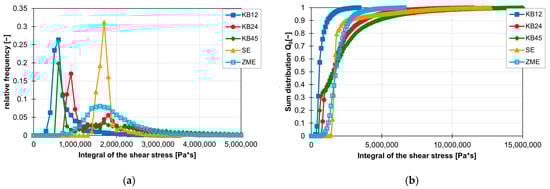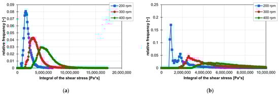 The influence of rotation speed on the integrals of the shear stresses is similar to the influence of speed on the shear stresses. The integrals of the shear stress increase with increasing rotation speed. Thus, the first peak of the frequency distribution of the ZME at 200 rpm is still at 1,600,000 Pa*s, but at 300 rpm, it is already at 3,100,000 Pa*s and finally at 400 rpm at 4,700,000 Pa*s. In the case of KB24 in Figure 22b, the integral of the shear stress also increases with increasing rotation speed, but here again, the curve of the frequency distribution of the shear stress integrals is clearly influenced. The first peak at 200 rpm disappears completely, and the curve flattens out at 300 and 400 rpm. Figure 22a,b also clearly show that as the rotation speed increases, the curve of the frequency distribution of the shear stress integrals is stretched and thus, the slope to the peaks decreases.